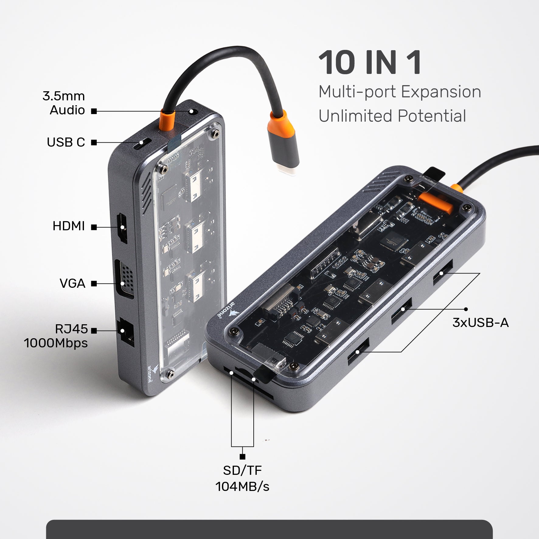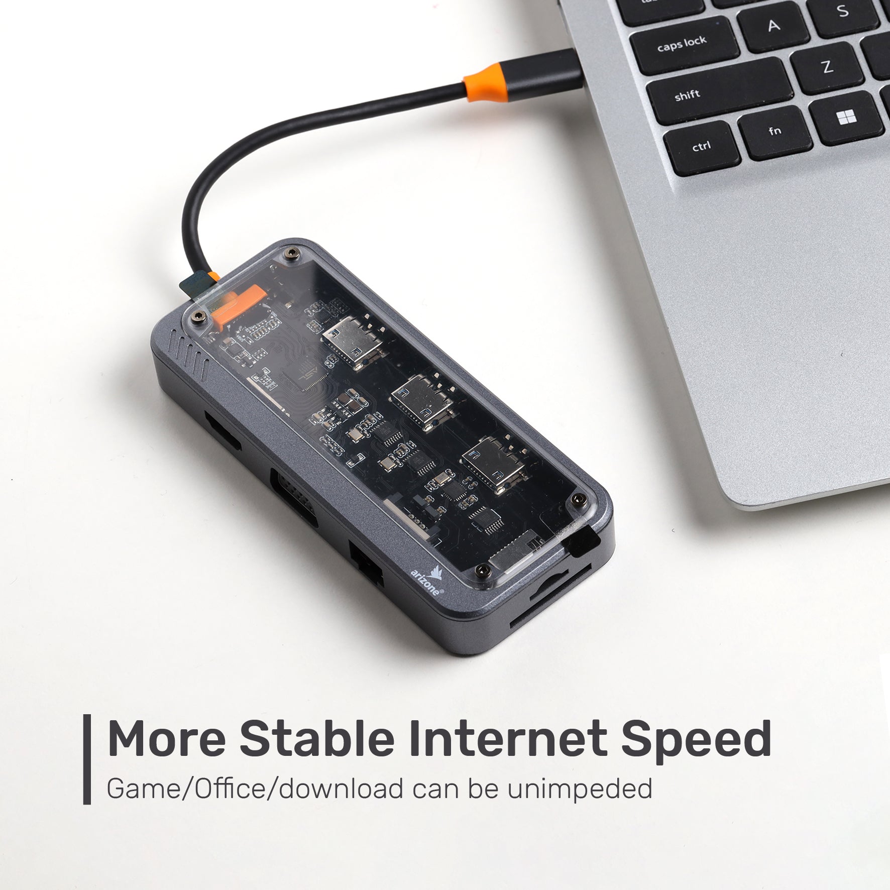 ARIZONE USB HUB SW10V 10 IN 1Multi- port Expansion unlimited potential1*USB 3.0/2*USB 2.0/HDMI/RJ45/VGA/USB-C PD/SD/TF/3.5mm 100Mbps*HDMI Supports A...